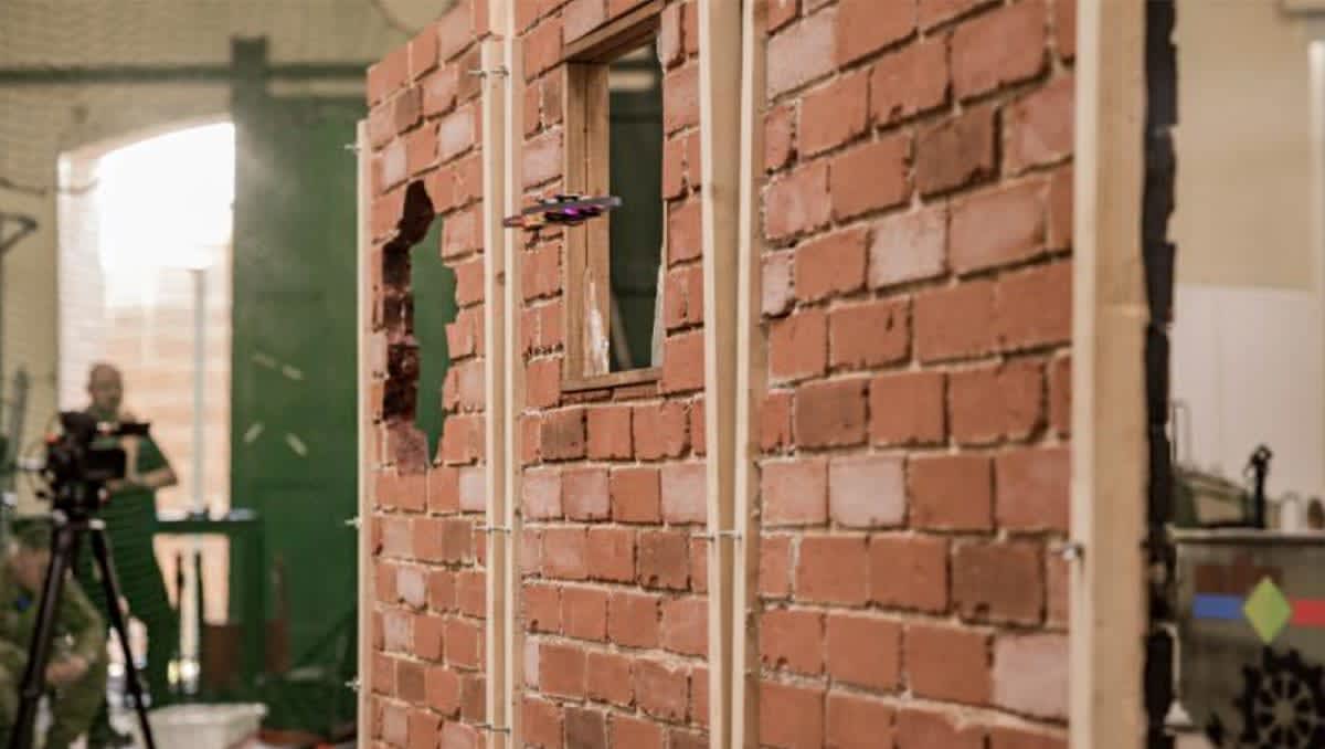 An uncrewed aerial system navigates the urban-style challenge course during the Rise of the Drones finals at Victoria Barracks in…