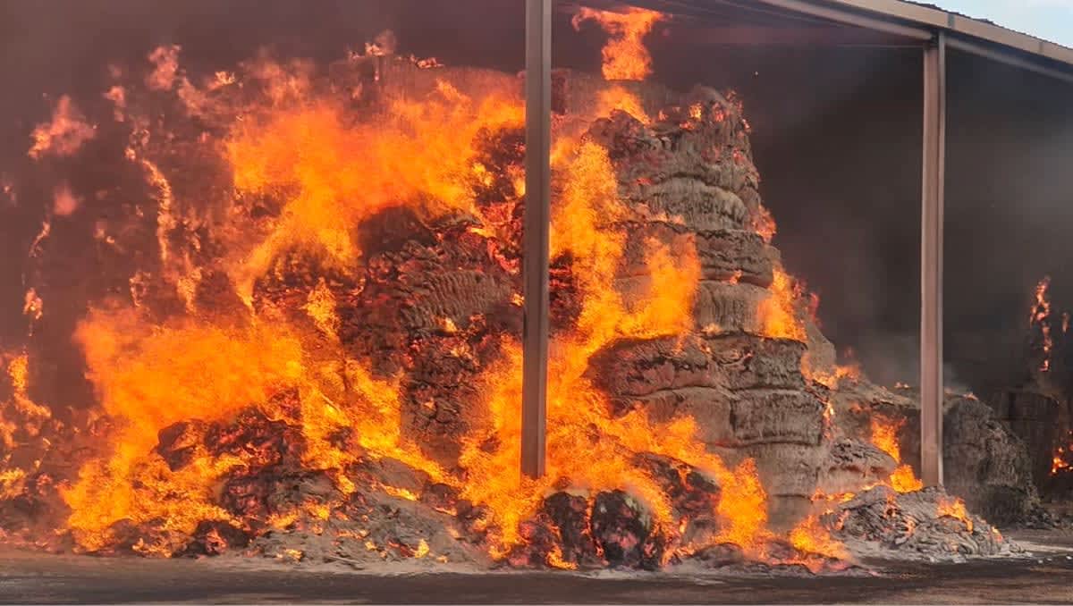 Hay bales on fire at a barn in Katherine, NT. (Image: NT Fire and Rescue) Royal Australian Air Force firefighters…